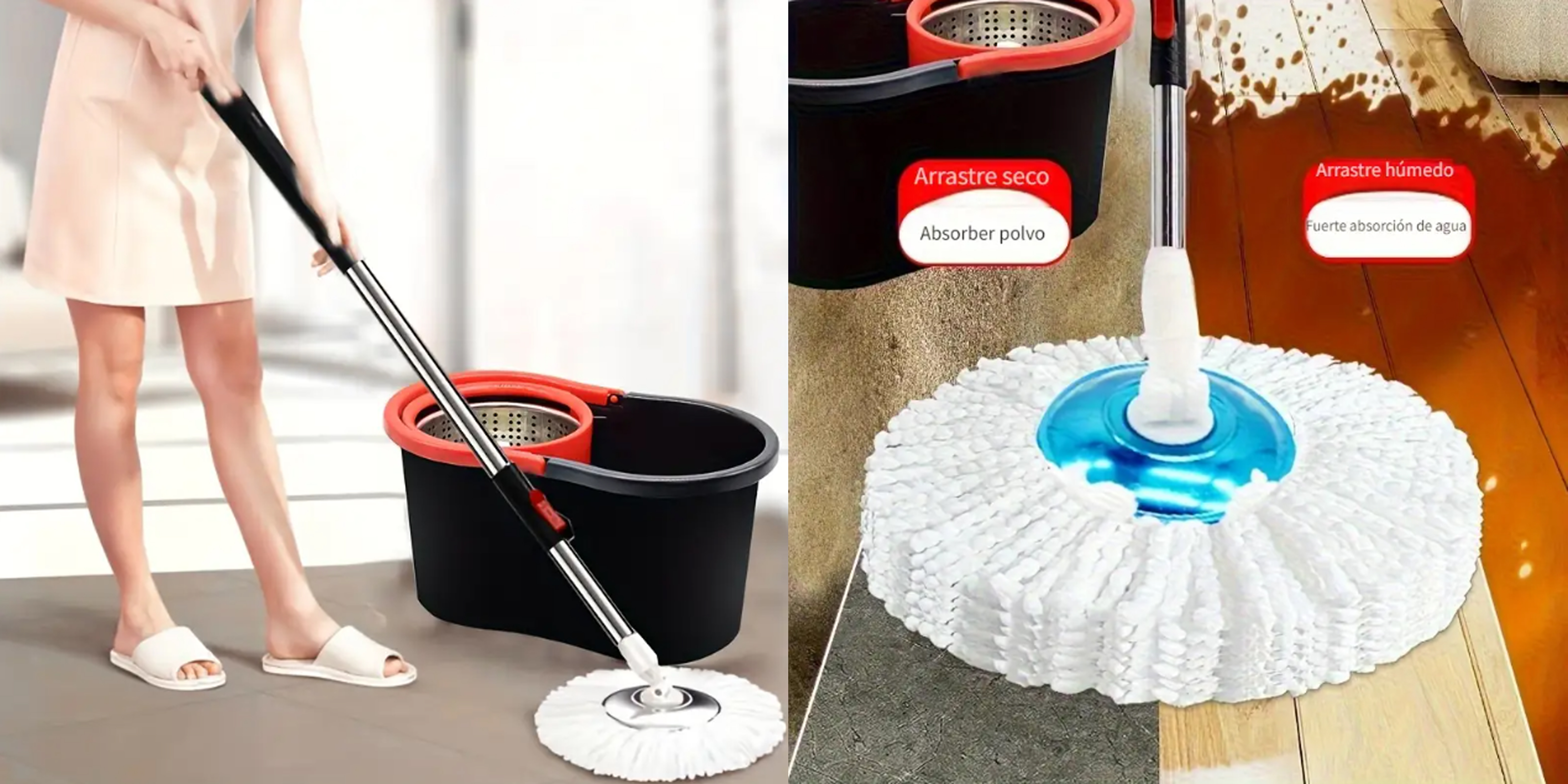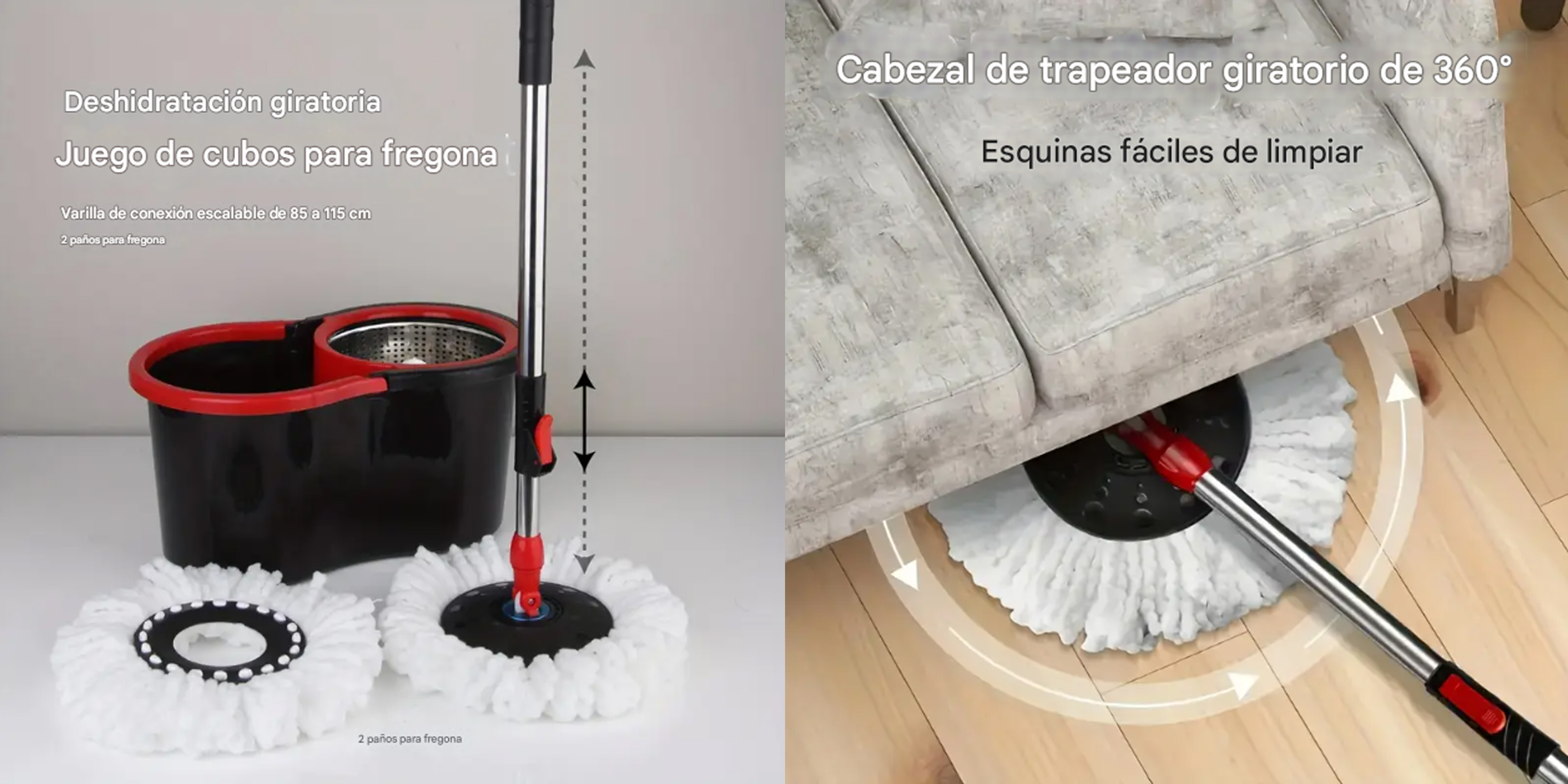 Viene con repuestos universales de mopa, fáciles de reemplazar y conseguir. El plato giratorio de plástico se activa por presión sobre el bastón, sin mecanismos frágiles.