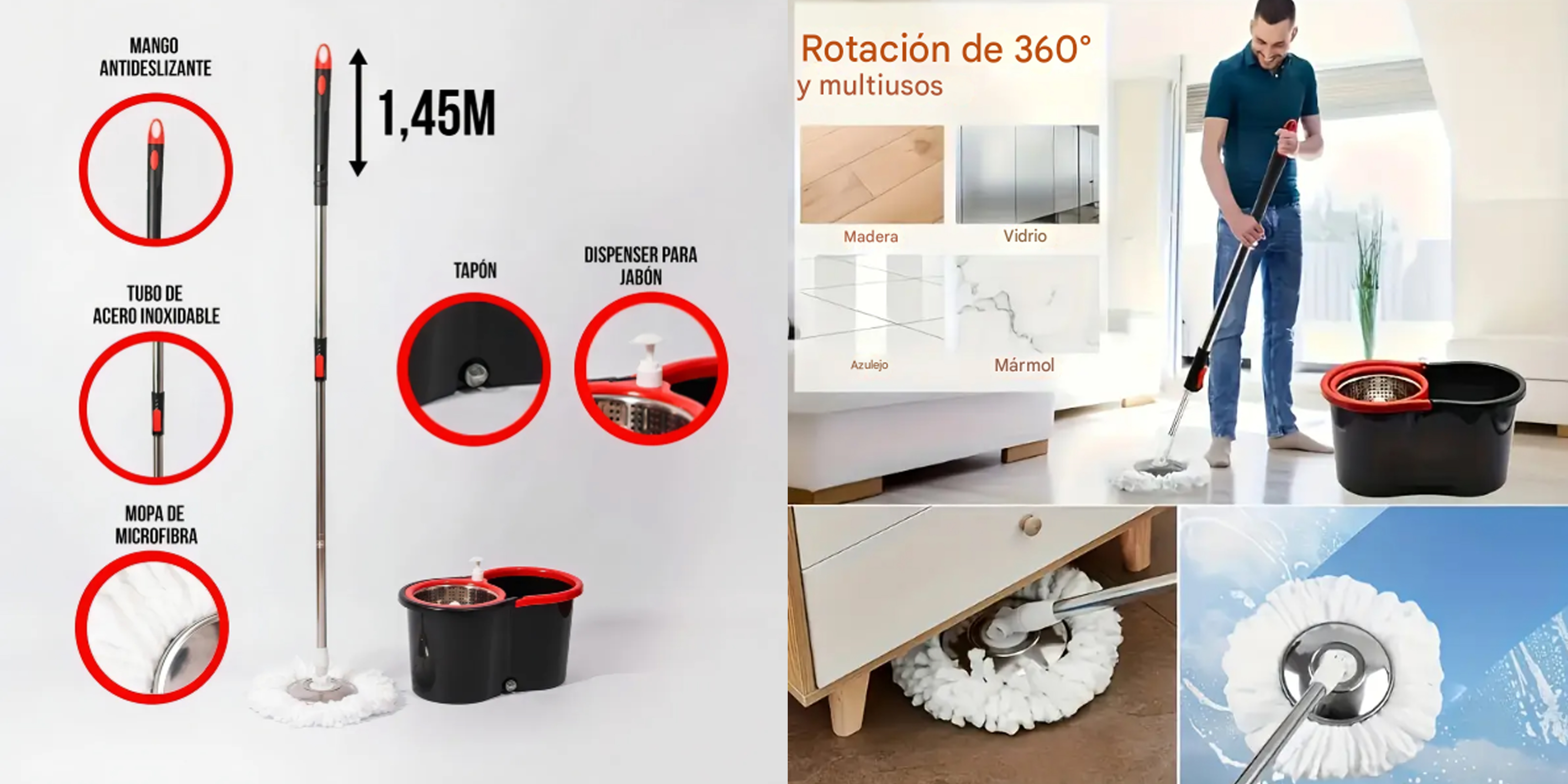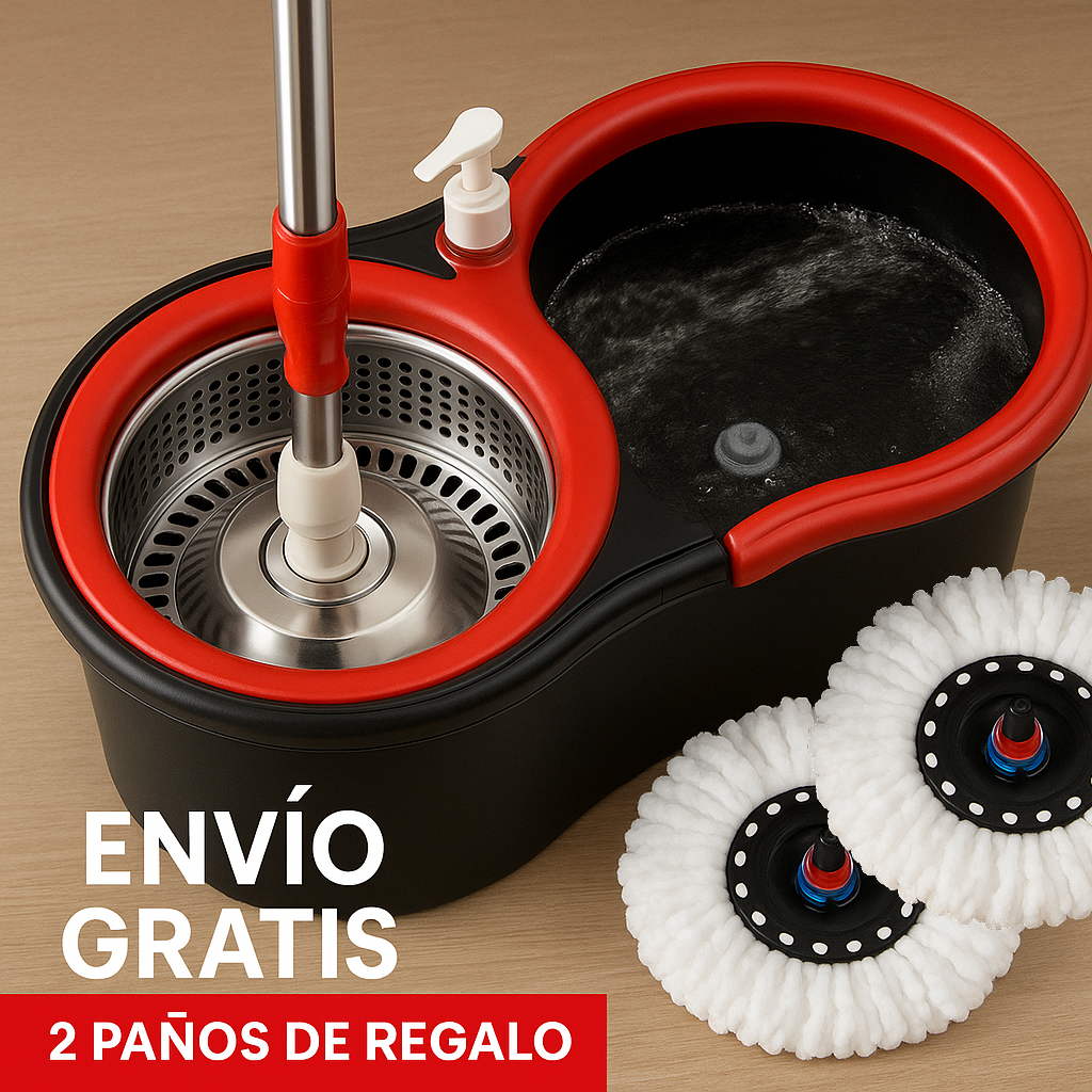 Incluye 2 paños superabsorbentes de alta calidad y dispenser para jabón incorporado. Ideal para limpiezas profundas en pisos, cocinas, baños, oficinas o comercios.