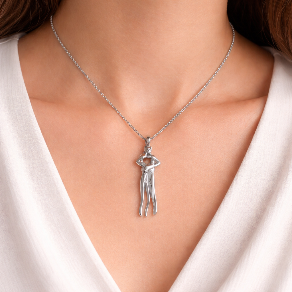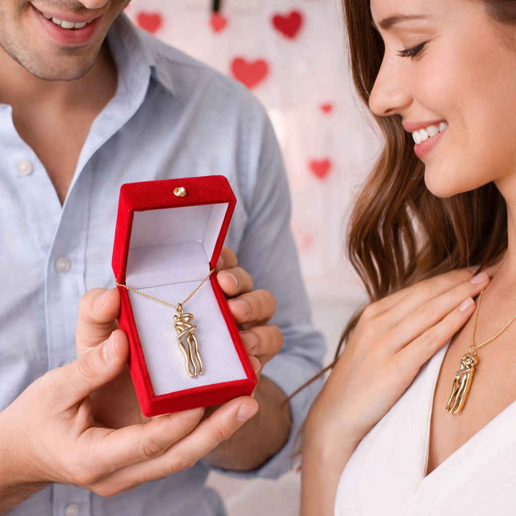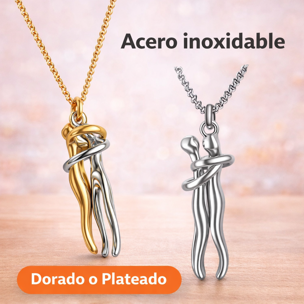Este collar simboliza el amor en su forma más pura. Su dije representa dos figuras abrazadas, un diseño artístico que transmite unión, contención y afecto. Una joya moderna y significativa, ideal para regalar o compartir con alguien especial.