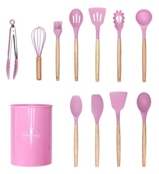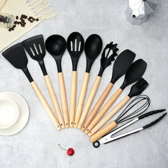 Renová tu cocina con este set completo de 12 utensilios, diseñado para ofrecerte comodidad, seguridad y estilo. Ideal para cocinar sin dañar tus ollas y sartenes, combinando mangos de madera de bambú con puntas de silicona de alta calidad.