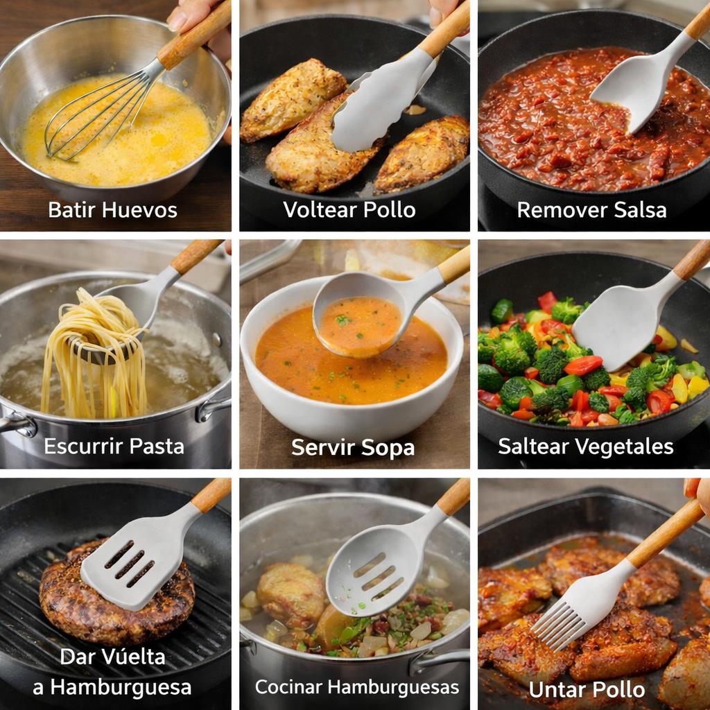 "Me encantó el diseño y lo cómodo que es usarlos. Los mangos de bambú son súper ergonómicos y la silicona no raya mis sartenes. Muy completo y práctico."