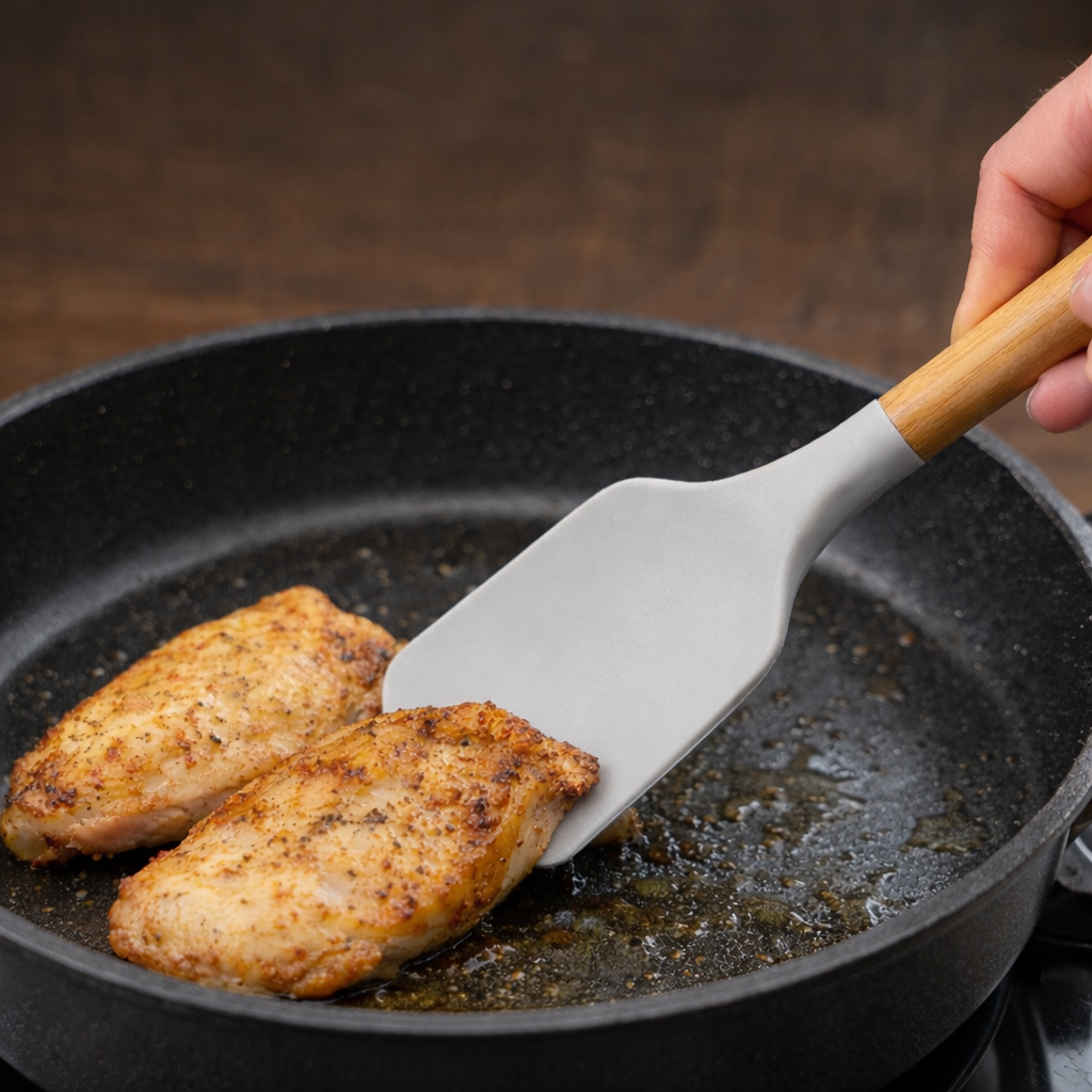 La silicona flexible y no abrasiva evita rayaduras en superficies antiadherentes, prolongando la vida útil de tus sartenes y ollas.