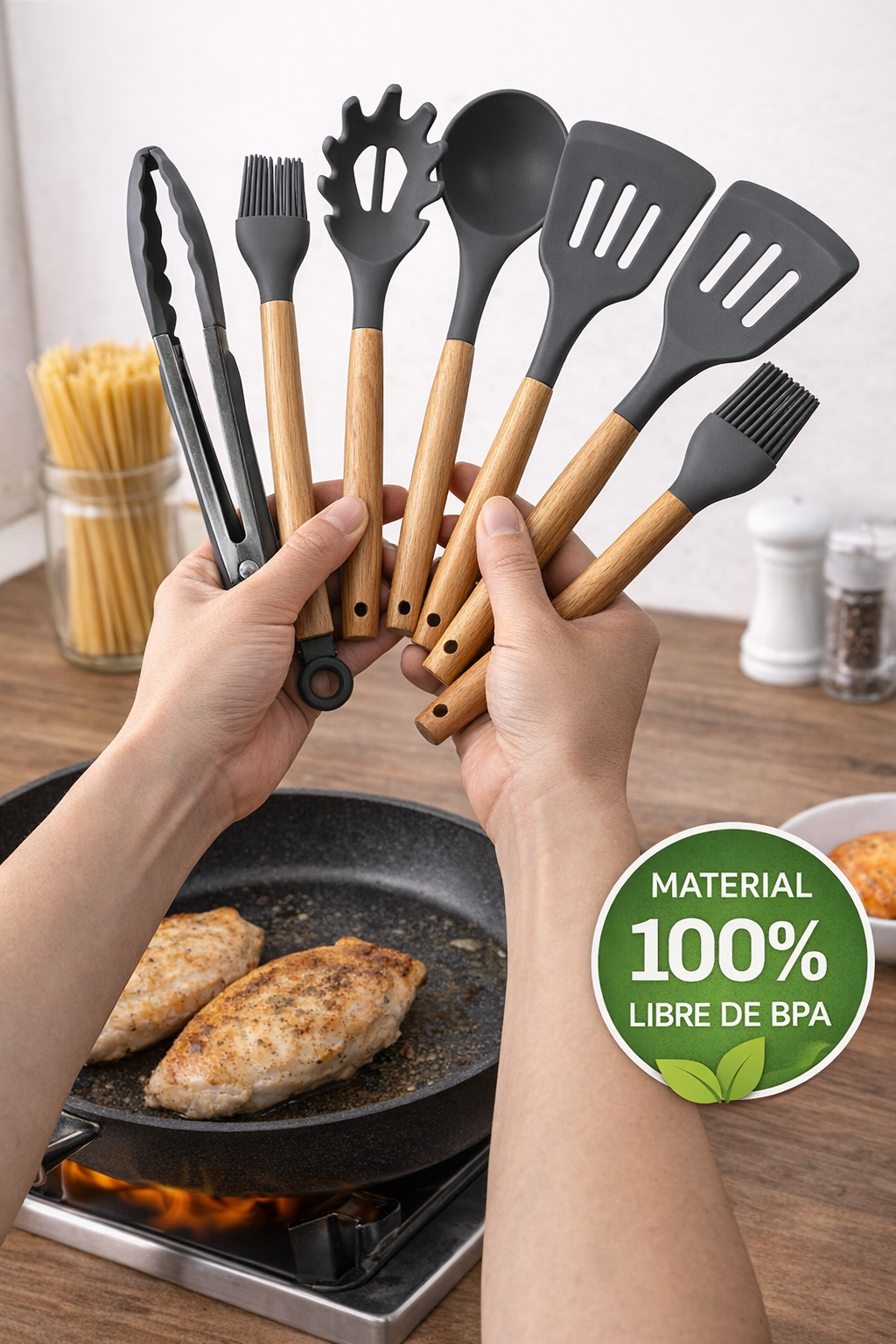 "Hermoso set. Los utensilios son firmes, livianos y no rayan nada. Las puntas de silicona son suaves pero resistentes, y los mangos de madera se sienten de muy buena calidad. Mi cocina quedó divina."