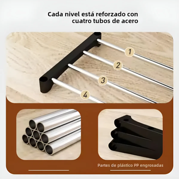 Fabricado con estructura metálica + plástico reforzado, es un zapatero liviano (1.5 kg), fácil de mover y resistente al uso diario. Su estilo clásico combina con cualquier ambiente, aportando orden y estética a tu hogar.