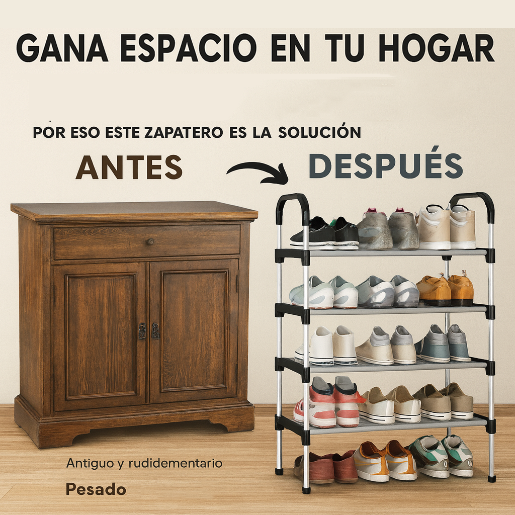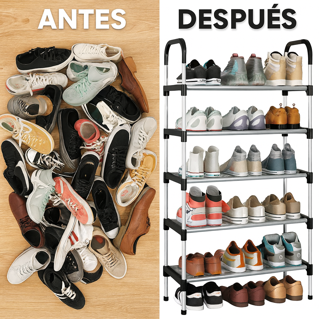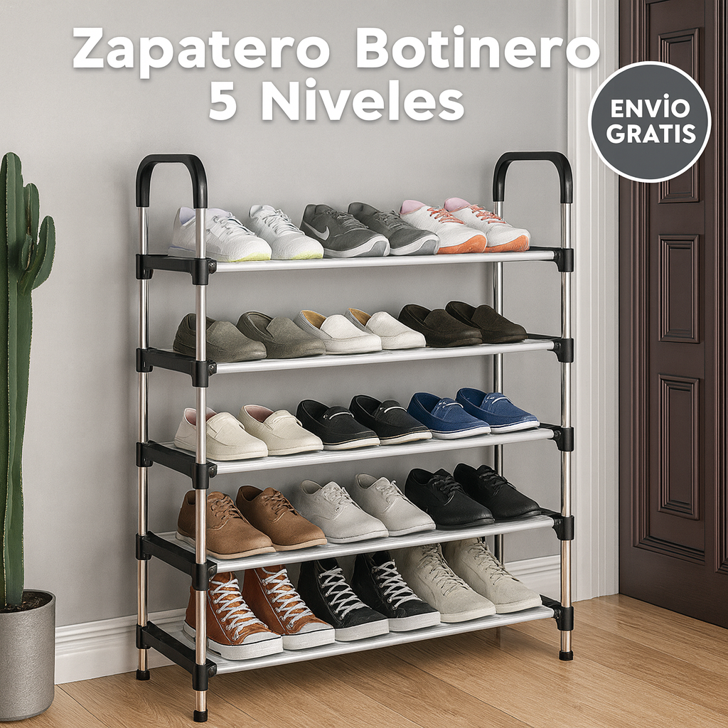Con sus 5 niveles amplios, podés guardar zapatillas, sandalias, botas cortas, calzado diario o de temporada. Su formato vertical hace que ocupe muy poco espacio y mantenga todo a la vista y al alcance.